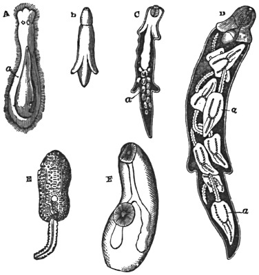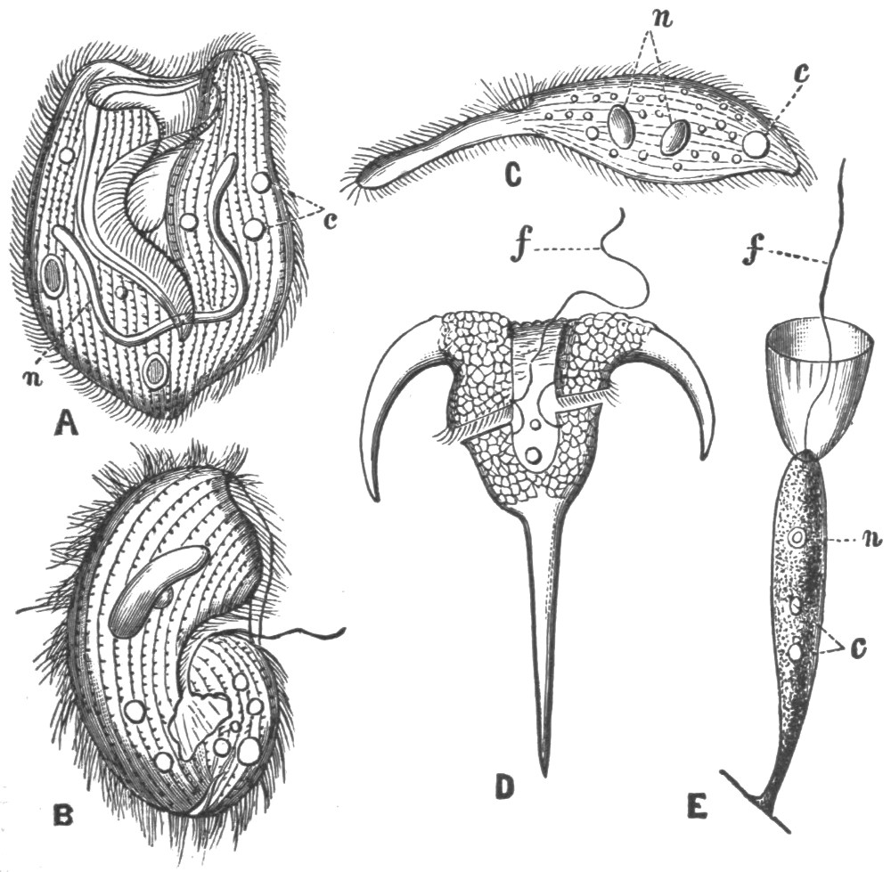 Fig. 4.—Ciliated Infusoria: A, Bursaria; B, Nyctotherus; C, Amphileptus; D, Ceratium; E, Monosiga; f, flagellum; n, nucleus; c, contractile vesicle.