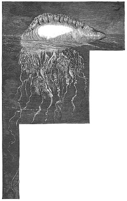 In the Santa Catalina Channel a beautiful lavender-hued form is common, the water being alive with them at times, and I have seen specimens with tentacles streaming behind them an estimated length of twenty feet, the entire animal appearing like a huge comet in the blue sky of the ocean. Mrs. Agassiz describes a jellyfish called Cyanea which was six feet across its disk and which had tentacles over one hundred feet in length. Specimens have been seen in East Indian waters which were much larger, having an estimated weight of several tons. An English naturalist describes one which stranded in India and gave out so vivid a light at night that the natives were afraid to approach it; yet large as was this monster, a few hours in the sun caused it to disappear or literally evaporate, water forming so large a part of its make-up.