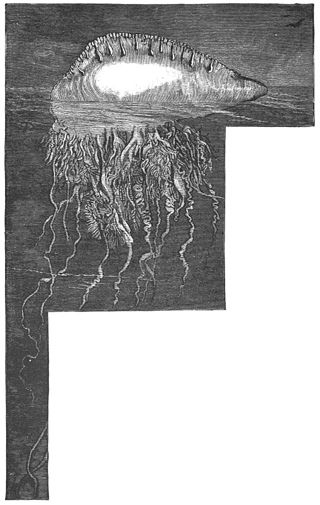 This peculiar phosphorescence is not their only interesting feature. Nearly all the jellies afford protection to fishes, crabs, and various small animals. As I drifted over the waters of the Gulf of Mexico almost every large jelly that I examined had one or more little fishes of the mackerel family up among its lobes or tentacles. As they always resembled the tentacles in tint or color, a delicate pink, they found protection amid the death-dealing darts. The most remarkable example of this strange companionship of dangerous jellies and delicate fishes is found in the Physalia, or Portuguese man-of-war (Fig. 26), one of the most beautiful of all the animals that make up the group to which the jellyfishes belong. Physalia is a bubble tinted with purple hues, four or five inches long—a fairy ship of pearly tints. On its upper portion is a sail which can be raised and lowered, while from the lower part depends a mass of beautiful blue or purple tentacles which sometimes are nearly one hundred feet in length. During the summer of 1902 I found them on the outer islands of the Texan coast in great numbers, stranded on the sands, while[34] scores of others sailed on through the pass into the quiet waters of Aransas Bay. Among the islands of the Tortugas group I often saw them dotting the calm waters, the sunlight on their delicate tints presenting beautiful combinations of colors.