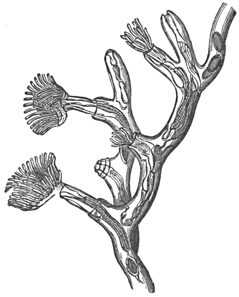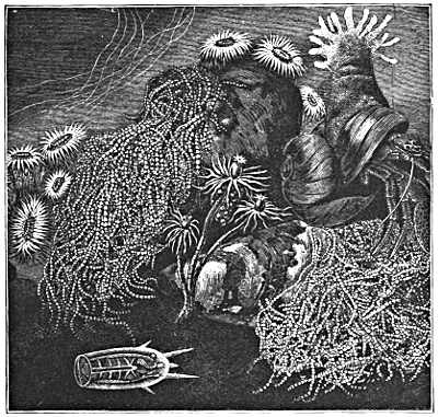 Some of the sponges have very singular shapes. One is called the finger sponge, and often takes the form of a hand. Others are very long and slender (Fig. 17). Some are perfectly round; others creep over stones and form a brilliant red matting, a charming object in the water.