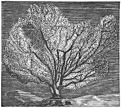 Among the commonest objects seen on the reef were huge vases (Fig. 13).[19] They were found in water from a foot to fifteen feet or more in depth, and were attached so strongly to the bottom that it required considerable strength to lift them up. Some were three feet high, and I have often dived down to them and for a few seconds sat upon them as a jest for the edification of my companions in the boat above. A common name for them on the reef was "Neptune's Seats." The seats were sponges, and their collection on the Florida reef has for many years constituted an important industry, vessels being fitted out from Key West and other places for this purpose. This industry is also followed in the Mediterranean Sea, where the finest sponges known are found. To take them, men go out in small boats, and in shallow water bring them up with hooks. In the greater depths a water box is used, a box with a glass bottom, which placed over the water makes everything visible, and by this the sponger secures the sponge. Other collectors, especially those of Syria, dive for them and wrench them from the bottom, then ascend to the surface with the load. There are many different kinds of sponges, those commonly used being divided into grades, from the delicate face sponge to the coarse specimens used for washing carriages. Then there are hundreds of kinds of sponges which have no value but to form veritable mimic forest growths at the bottom of the sea (Fig. 14). Some grow upon stones or sea mud and are brilliantly colored; others again are like glass, and all represent one of the lowest forms of animal life, yet one of the most beautiful, and one that is very useful.