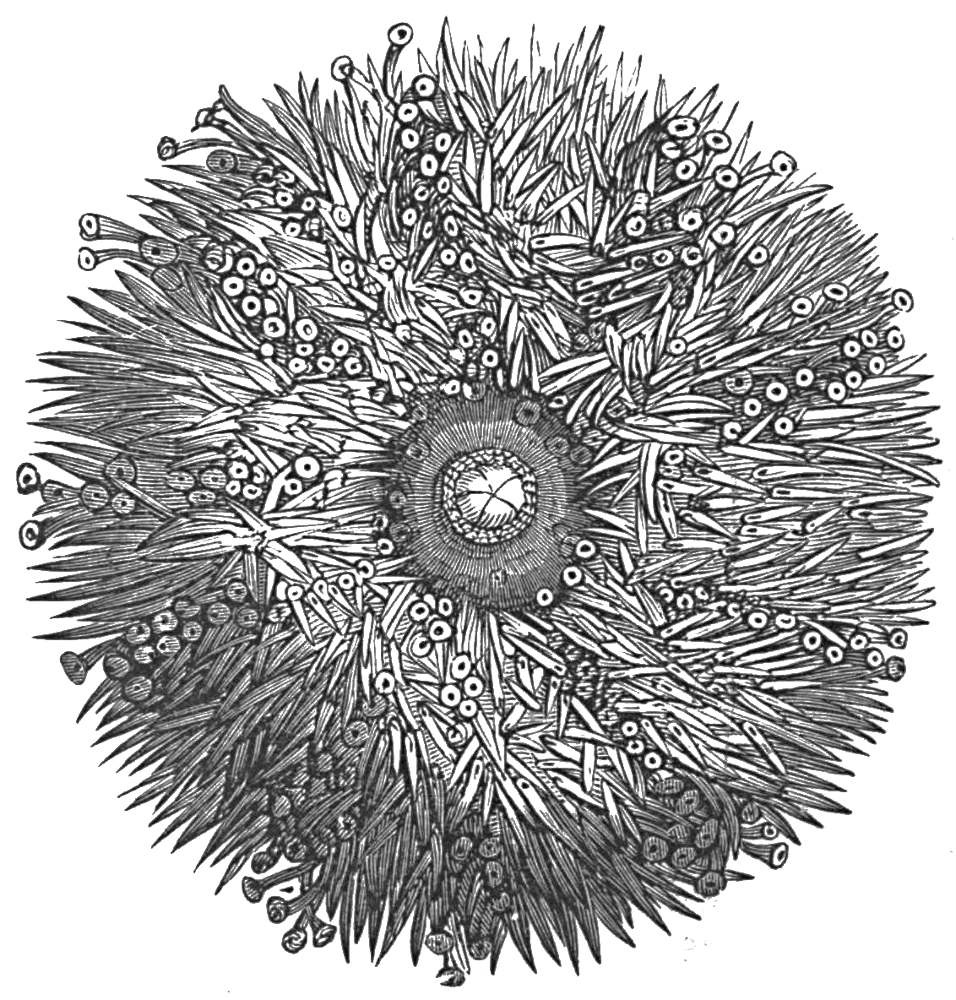 In our section of a sponge we may follow the winding channels which connect one part of the sponge with the other, and we see that the body is a mass of fibers made up of curious and beautifully shaped objects called spicules (Fig. 15). The spicules are the bones of sponges, the hard[22] portion, the framework. In the sponge we find here and there little oval rooms, and in these are packed, side by side, minute objects with tails (Fig. 16). Each little cell has its tail upon the outside, which is really a whip or lash, used for capturing passing food. In these rooms the cells congregate and are fed by the constant onward flow of water laden with food. The food is in the shape of minute animals and plants which these little whips catch as they pass by. The whips have another purpose; their constant motion serves to force the water along through the canals, carrying air as well as food.