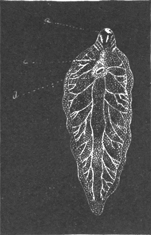 We may watch it at its dinner. When a victim is found, an animal smaller than itself, out shoots a little cape or extension from the clear rim, creeping slowly up the side of the animal; and if we watch very closely, we shall see the thicker portion of the Amœba, that which calls to mind ground glass, running or flowing into it. Then another false foot, as it is called, slowly creeps out on the opposite side and joins its companion, more of the ground-glass matter slides or pours into this, filling it out, and, presto! the two arms merge one into the other. The victim has been swallowed and is now being digested (Fig. 2, d).
