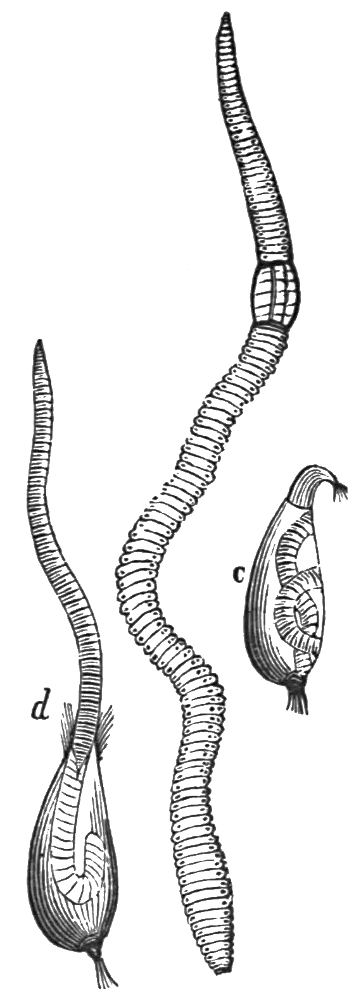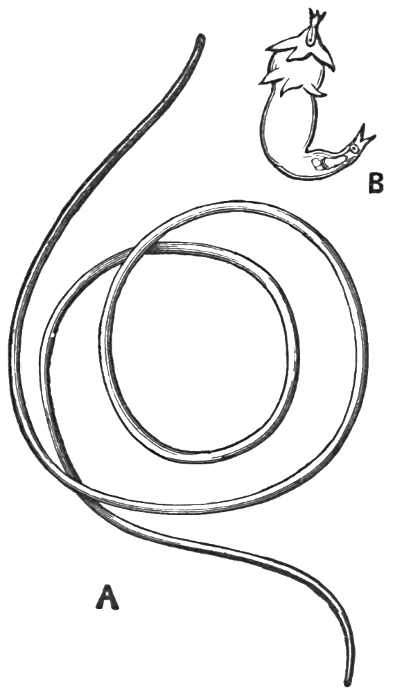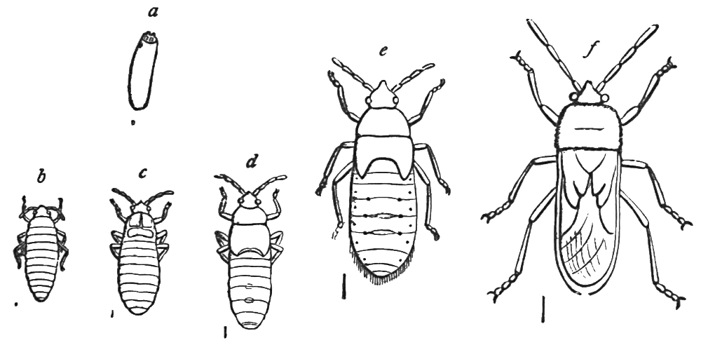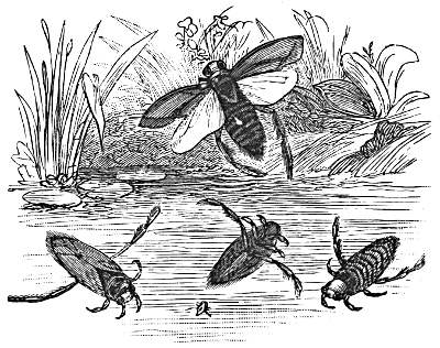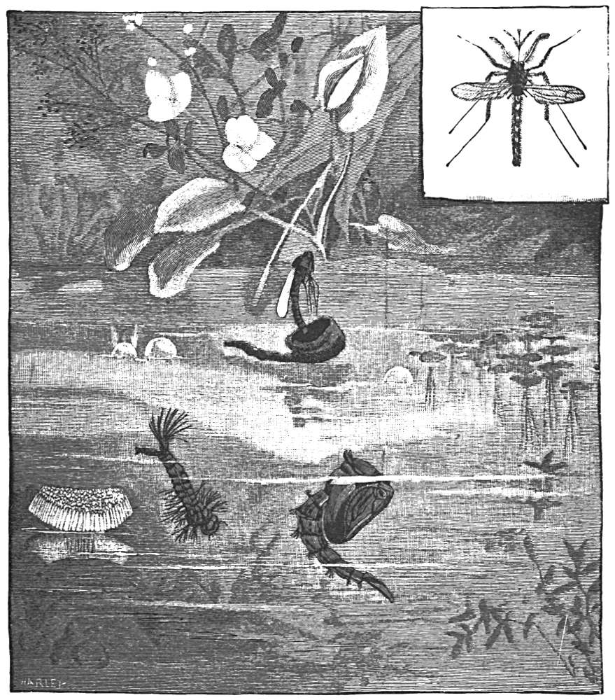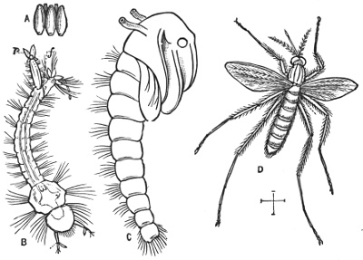 The development of the mosquito is interesting (Fig. 226). The eggs are deposited as a boat-shaped mass on the surface of the water, where they drift about for several days. The larvæ appear as wigglers float[210]ing in the water, tail upward, and breathing through a tube at the tip of the abdomen which is projected above the water for the purpose. After a while the head grows larger, and several changes ensue. Then the pupa finally appears. This rises to the surface, and out bursts a full-fledged mosquito which, like a man in a canoe, balances itself while its wings dry. A few hours before it was entirely dependent upon the water and swimming in it, but now it appears to be fearful of overturning the frail craft and falling in where it would surely drown. If all goes well, it soon tries its wings and goes buzzing away. The devastation caused by the armed and bewhiskered mosquito is not generally known. Doubtless thousands have lost their lives from this unsuspected cause.