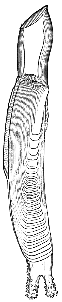 No more beautiful object can be imagined than this sponge, known as the Euplectella. It has great wisps of glasslike matter at the bottom, which anchor it in the sand or mud, and the framework appears to rise upward in whirls, the surface being made up of squares or basket work, so artificial that it is[25] difficult to believe that it is not of human make. This vase has a top to it. It is perforated with squares, and is often a prison for various small animals, as crabs, which have passed into the interior when very small and which are now too large to escape, only their claws or feelers being seen protruding through the little portholes.