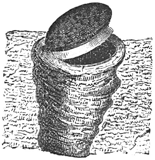 The wasps (Fig. 253) live in societies of males, females, and workers. The paperlike nests are familiar objects in the woods, resembling great bags of paper which when opened are seen to be filled with cells. Many nests are of beautiful shapes, resembling candelabra, while the cells of the common mud dauber (Fig. 254) call to mind the adobe houses of the Mexicans and Indians of the Southwest. The mud cells of a South American wasp resemble bottles (Fig. 255). Many of the large wasps are fierce and vindictive, and nearly all resent an attack upon their homes.