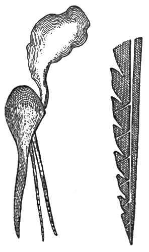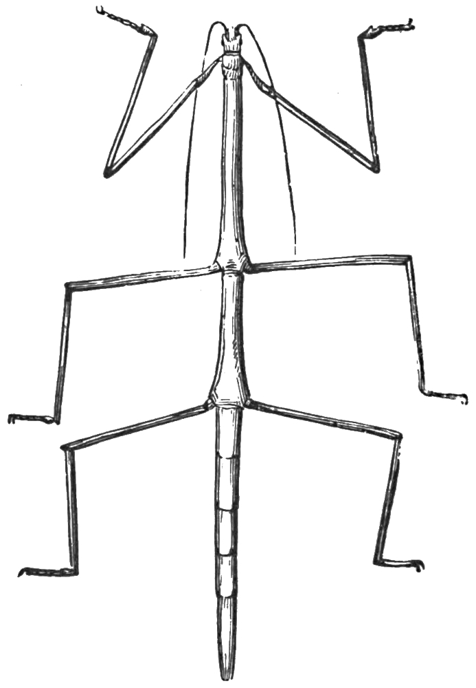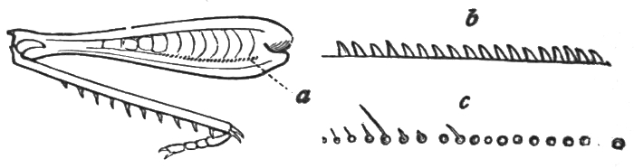 The proboscis, or sucking weapon, of the mosquito (Fig. 223) is an innocent-appearing object when closed; but when the sheath is open it displays a series of scimeter and sawtooth daggers (Fig. 224), which fully explains the torture of the mosquito bite or that of the gnat which crawls up one's sleeve (Fig. 225). In all these extraordinary weapons we find the same organs, the labium, labrum, and others, but with greater or less development, according to the nature of the insect.