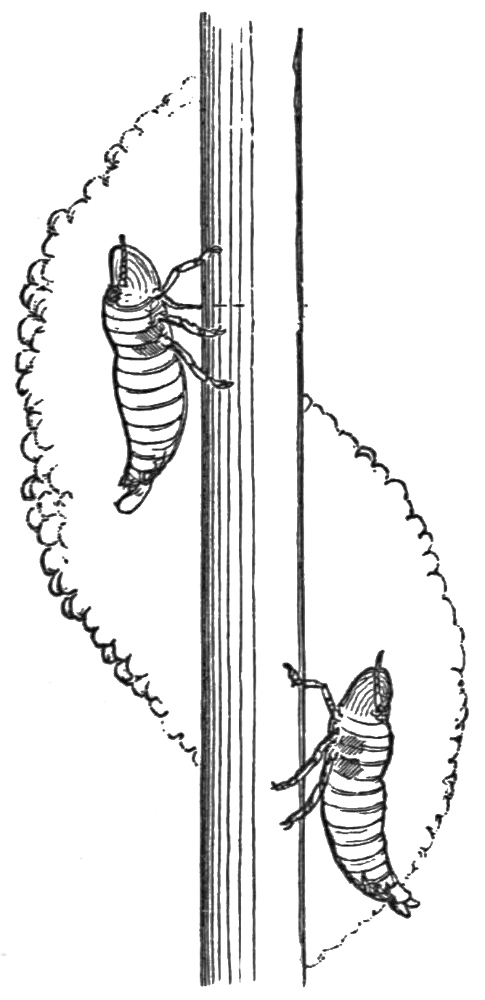 The moths display as great a variety in their shapes, colors, and sizes as the butterflies. The death's-head moth (Fig. 239) is perhaps as startling as any, bearing on its back a well-defined figure of a skull. The most valuable[219] moth to man is the silkworm moth, the wings of which have a spread of six inches and are a brilliant ochre yellow, fawn, or mouse color, marked with striking peacock-like eyes. They deposit eggs, but the development of the caterpillar is somewhat different from that of the butterfly larva. The latter passes its pupa stage as an unprotected chrysalis attached to some object by the tail (Fig. 240), but the caterpillar of the moth secretes silk from a gland in its head, and with this forms about itself a cocoon. This is unwound by machinery and woven into the valuable silk of commerce. The silk industry brings to the weavers[220] of the United States alone an annual sum amounting to about $30,000,000. The silkworm can easily be kept and all its changes watched, and many persons are interested in rearing the worms. The time required by the worm to form its silk cocoon varies with the locality. Thus in France it will complete it in four days, while in England forty or more days are necessary. About two hundred cocoons weigh a pound.