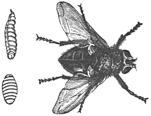 Closely allied to these forms are the fleas (Fig. 228), which are at once interesting and irritating. They are wingless, and have two simple eyes. The larva resembles a small caterpillar. It attains its growth in twelve days, then enters a small cocoon, which it weaves. There it remains for sixteen days, when it breaks forth a full-grown flea. Of all insects the fleas are the most amenable to instruction. Some years ago a flea circus was one of the attractions of New York, where, by looking through a magnifying glass, one could see fleas dragging chariots with other fleas dressed as cavaliers sitting on the seats. Many other seemingly impossible feats were exhibited.