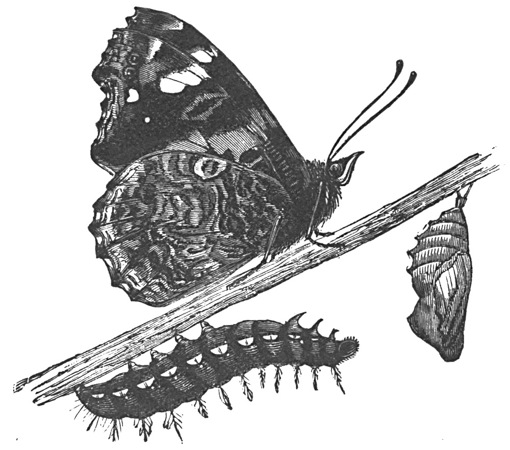 The ordinary caterpillar is the larva of the butterfly. The eggs are deposited on leaves and various places, and soon hatch into caterpillars (Fig. 232). These lead a predatory life for some time, doing a vast amount of damage, almost every plant having its peculiar pest. Some affect one tree, some another. The famous elm trees of many of the New England cities have more than once[214] been threatened by these larvæ. They shed their coats several times. The caterpillar finally merges into the chrysalis, from which it escapes as the perfect insect. All of these changes can easily be observed by keeping a caterpillar under continuous observation. The butterflies have well-developed legs, but they rarely use them for locomotion, preferring to fly from flower to flower. The tortoise-shell butterfly is a familiar form (Fig. 233), its marvelous colors resembling this shell. Some have an under covering of pure silver. Another conspicuous form is the white butterfly (Fig. 234), which, as its name suggests, is pure white, with several black spots.