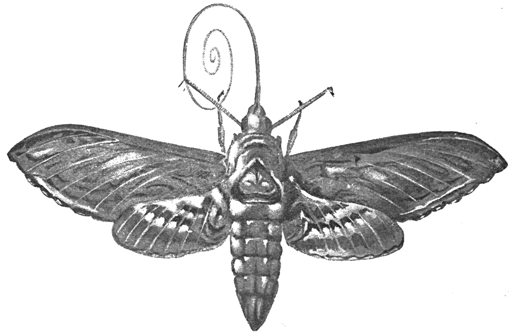 The butterflies are included in the Lepidoptera, and are the day-flying forms. There are many other insects equally beautiful, in more subdued tints, which are night flyers. These are the moths (Fig. 237), which are slow of flight, ponderous, and have extraordinary tongues for sucking the juices[218] from the flowers. They can be distinguished from the butterflies by their feathered antennæ. One of the best known for its ravages is the dwarf moth, the worm of which plays such havoc among woolens. The cankerworm moth is equally a pest among valuable shade trees. Another familiar form is the hawk moth (Fig. 238), which so resembles a humming bird in appearance and motion that it is almost impossible to distinguish between the two, the moth being one of the most active, poising over flowers and inserting its enormous tongue to secure the sweets there concealed. A showy moth is the huge Attacus, its larva being especially large and voracious.