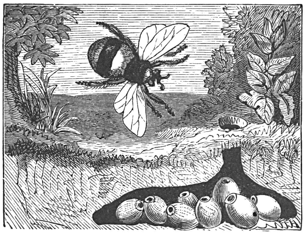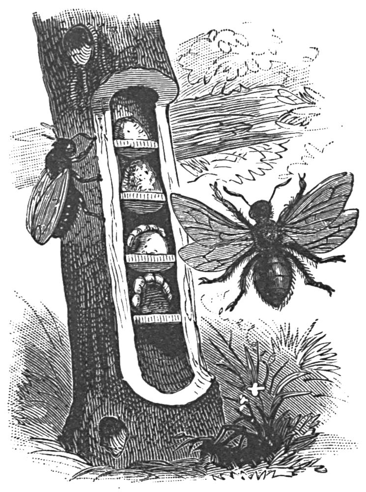Among the many kinds of bees the carpenters (Fig.[232] 251) are famous, boring tunnels into solid wood for the reception of their young; half an inch a day being accomplished by these little carpenters. The bumblebee, one of the largest, forms its nest in the ground (Fig. 252).