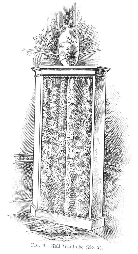 In the first place, the carpets should not be placed until the last man has departed; and in the second, it is infinitely better to have not only a regular carpet-layer, but a{19} man accustomed to hang pictures and arrange brackets, mirrors, &c. I personally have a great many pictures and odds and ends, and I have twice had a most excellent man from Shoolbred’s on these occasions, who came properly provided with nails, copper-wire, and all necessary tools, and who, for a little under 3l., quietly, swiftly, and skilfully placed the pictures, &c., in their places, with just a very little supervision from me; for, like all those who have no regular art education, he had the usual mania for hanging everything ever so much higher than it ought to be—a mania I most successfully and promptly combated! But beyond this, and giving him a few directions as to the placing of the pictures in due order, I left matters to him; and in three days—for, like an angel, he remained his Saturday half-holiday at my urgent request—all the walls were decorated and finished properly, which they could not have been in double the time had I been forced to rely on the help of those in the house.