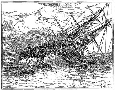The fore, main, and mizzen tops of the huge ship were all above water, and he climbs up into comparative safety. In the shrouds of the mizzentop he finds the admiral's baker, and sees the woman he has just pulled out of the port-hole rolling by. He seizes her once more, and hangs her head over one of the ratlines of the mizzen-shrouds, like clothes to dry, which is the best he can do for her; but a surf comes and knocks her backward, and "away she went, rolling over and over." Strangely enough, the poor creature is saved after all by the boat of a frigate lying at Spithead, whose captain has just put off to the rescue. "I must look to those who are in more danger than you, my lad," he sings out to our sailor, as he goes by.