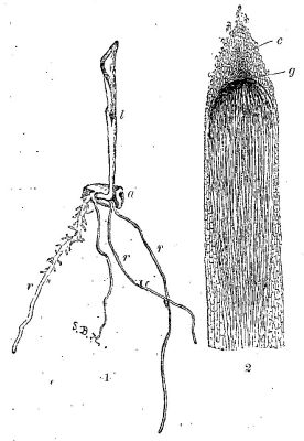 If you have a microscope[1] and a sharp knife, carefully split the end of one of these roots and look at it. If you have not, you will have to trust me so far as to take this drawing as correct (Fig. 1). All these tiny roots have a cap over their growing end, so that when they have to push their way among the hard earth and stones, the growing part will not get bruised. These roots take in all the water and the food which the earth supplies to the plant.