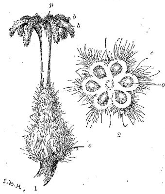 If you look at Fig. 4 you will see the pistil of a pansy, or heart's-ease. No. 1 is a side view of the pistil sliced down so you can see into it, as you can into a baby-house. You see the pollen grains, b, sending down their tubes to the ovules, o. No. 2 in this drawing is the front view of the heart's-ease pistil. The beautiful colored leaves of a flower are only meant to cover and protect the pistil and the pollen of the plant, as the fruit is meant to cover its seed. There has been a tender care for us in all this that the covering for both should have been made so beautiful and so delicious.