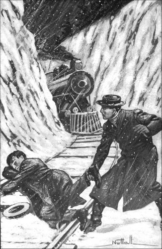 "I must save him—if I can!" he told himself. [288] "He must not be killed if I can help it!" And then, throwing himself face downward, he slid over the ice and snow to the bottom of the cut. His hands and face were scratched, but he paid no heed. As he touched the bottom he leaped up. The train was less than fifty feet away, the wheels grinding sharply on the tracks. He made one wild leap forward, caught Plum by the feet and dragged him out of harm's way. Then the train rolled on, coming to a stop a few seconds later.