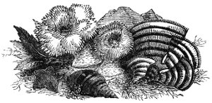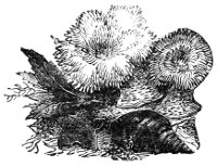 The Balani, or Acorn-shells, which are generally parasitic, fixing themselves to the shell of the Whelk or some other univalve, spread their crimson tentacles when seeking food exactly in the manner of the Serpulæ, the feathery filaments forming a kind of living casting-net, as it has been observed, in which the minute Annelid or Infusory is entangled and devoured. Two Balani are represented in Plate VII. on the shell of a common Whelk.