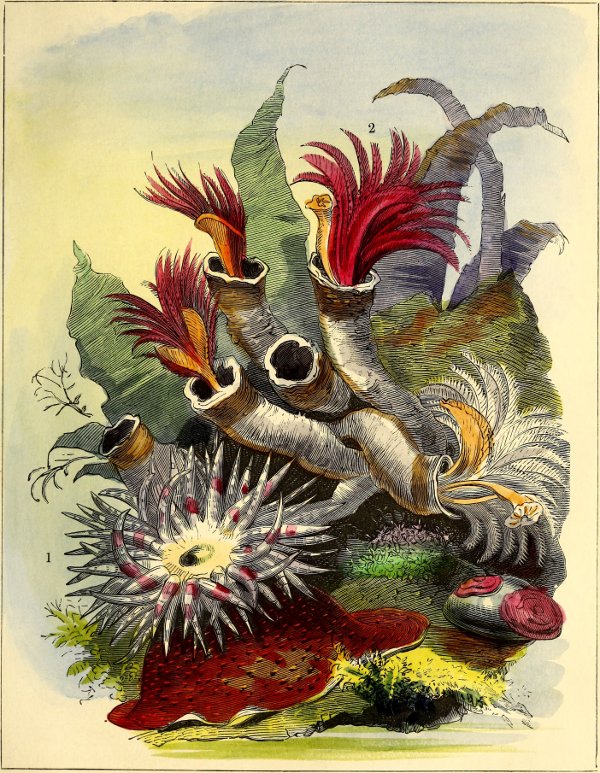 A marine Aquarium may be rendered very interesting without the introduction of fish, and as their presence requires that the water should be once each day aerated by means of additional water, introduced by the syringe or by a drip, continuing for some time from another vessel, many may prefer the lovely Sea-Weeds, curious Zoöphytes, and beautiful Molluscs, alone; as, if the balance between the amount of animal and vegetable life be felicitously balanced, and the natural scavengers, in the shape of Periwinkles and other Sea-Snails, for the consumption of decaying vegetable matter, and a few Prawns to perform a similar office for perishing Infusoriæ, or any other animal matter, be properly supplied—the tank may remain for a long time undisturbed, the supply of oxygen being ample for the lower classes of animal life alluded to. The beautiful Actiniæ, indeed, will exist in apparent health for a considerable time in water in which no vegetable growth has been introduced. Mr. Gosse describes 96instances in which the water in glass Aquaria, containing Sea-Anemonies, has remained perfectly pure for more than a year.