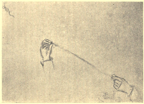 61One more instance of the connection of the art side with the constructive side. The children had been studying primitive spinning and carding, when one of them, twelve years of age, made a picture of one of the older children spinning. Here is another piece of work which is not quite average; it is better than the average. It is an illustration of two hands and the drawing out of the wool to get it ready for spinning. This was done by a child eleven years of age. But, upon the whole, with the younger children especially, the art impulse is connected mainly with the social instinct—the desire to tell, to represent.
