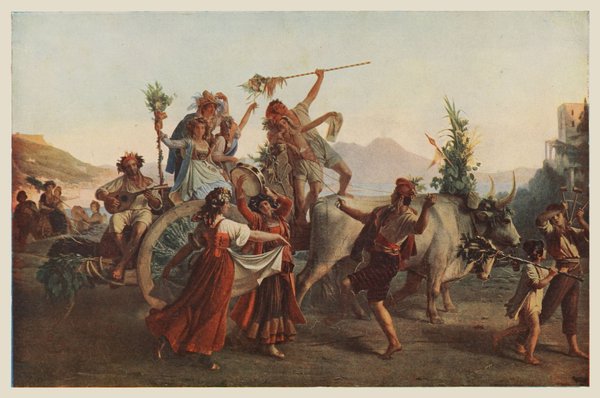 AU pied d’un arbre, Apollon, dieu des arts, est assis, un large manteau drapant son corps superbe d’Olympien. Sa tête est couronnée de feuillage, et son bras droit, appuyé sur sa lyre, est dirigé vers les tablettes d’un jeune poète qui, le visage illuminé d’une flamme idéale, sent pénétrer en lui le souffle divin de l’inspiration. Deus, ecce Deus! Le visage frémissant du néophyte traduit à la fois la joie, la ferveur et l’extase. Au-dessus de sa tête vole un Amour, porteur de couronnes dont il va ceindre le front du poète. Vers lui se tourne également un autre Amour, armé du carquois symbolique, qui semble lui promettre d’autres lauriers, aussi doux que ceux de la gloire. Derrière le dieu, et contemplant la scène, une femme d’une idéale beauté, muse ou déesse, écoute d’un air ravi les strophes inspirées du jeune et charmant rapsode.