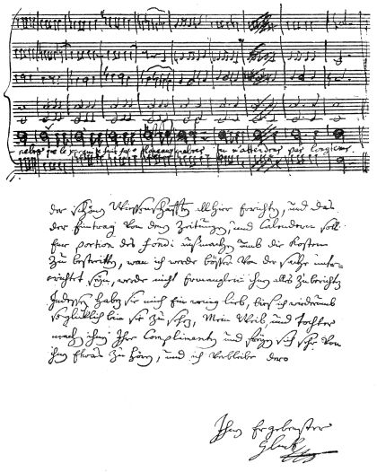 Fac-simile autograph letter and musical manuscript by Gluck.