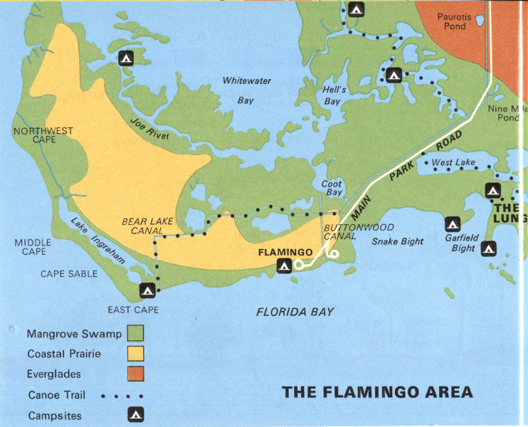 When you reach Flamingo, a former fishing village and now a center for visitor services and accommodations, you will be on the shore of Florida Bay. Here is an environment rich in variety of animal life, where porpoises play, the American crocodile makes its last stand, and the great white heron, once feared doomed to extinction, holds its own. The abundance of game fish in the bay has given it a reputation as one of the best sport-fishing grounds on the east coast.