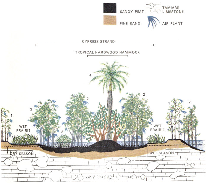A spot in the glades where the limestone base is elevated just 2 feet will be occupied by a small forest of tropical hardwoods and palms—a 14 “hammock” much like those of the pinelands. A low spot—just a few inches below the general level of the limestone base—will remain wet even in the relatively rainless winter when the sawgrass becomes tinder dry. This sloughlike depression will support a stand of baldcypress, called a “cypress head.” Other tree islands, called bayheads and willow heads, develop in many places where soil and peat accumulate.