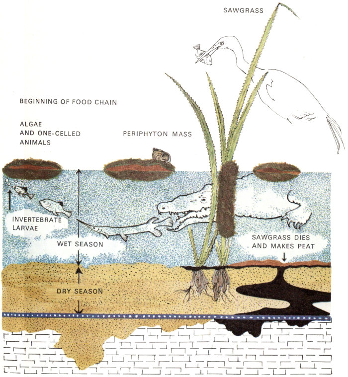 Use the trails that have been laid out to help you see the communities. They make access easy for you; the rest is up to you. Be observant: notice the stemlike root of a saw-palmetto in a damp pothole of the pineland; look closely at the periphyton that plays such an important role in the glades food chain. Note the difference in feeding methods of wading birds; each species has its own niche in the habitat. Most of all, get into the habit of thinking of each animal, each plant, as a member of the closely woven web of life that makes up an integrated community.