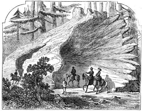 “In the South Park and Calaveras groves there are some remarkable trees. One tree in the South Park grove will hold forty persons in the hollow of its trunk; another has sheltered sixteen horses. The four highest trees in the Calaveras grove, are the Keystone State, 325 feet high, Gen. Jackson, 319 feet, Mother of the Forest, 315 feet, and the Daniel Webster of 307 feet high. The Husband and Wife are a pair of trees gracefully leaning against each other, 250 feet high, and each sixty feet in circumference. The Hermit is a solitary specimen of great proportions; the Old Maid, a disconsolate looking spinster, fifty-nine 341 feet around, and the Old Bachelor, a rough, unkempt old fellow nearly 300 feet in height. The Father of the Forest is prostrate, hollow, limbless and without bark; yet across the roots the distance is twenty-eight feet.... Into the tree a tourist can ride ninety feet on horseback. One of the largest trees of the Calaveras grove was bored down with pump augurs, and the stump smoothed off and converted into a floor of a dancing hall. Thirty-two persons, or four quadrille sets, have ample room to dance at one time, and yet leave room for musicians and spectators.”