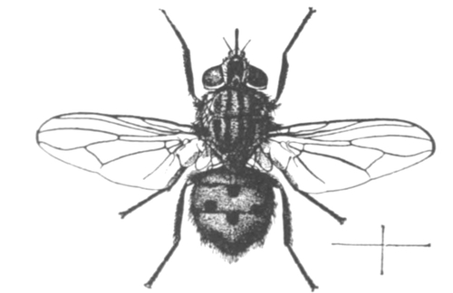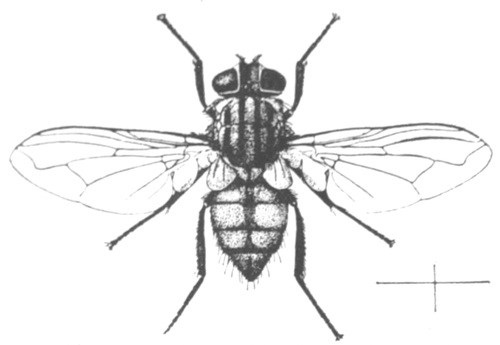 The Anthomyidæ are a family of about 250 small and medium sized garden frequenting and country flies, mainly of flower and honey seeking habits. Nevertheless, some are dung-frequenting; none are blood-sucking, but several are cattle-pestering sweat-flies, which, even more pertinaciously than the house-fly, will circle round one's head and repeatedly buzz against one's face. Of these, the small Hydrotœa irritans and Hy. dentipes are amongst the worst offenders. A few of the Anthomyidæ are vegetarian garden pests; the larvæ of the cabbage-fly, the root-fly, the onion-fly and the celery-fly are, in some seasons, very destructive. The so-called "turnip-fly" is a small striped beetle of the same genus, Phillotreta, as the unstriped "flea-beetle" of the hop-fields. The larvæ of the majority of the species of the family of Anthomyidæ are, more or less, feeders on decadent vegetable matter, but some, like those of the genus Fannia, are preferentially feeders on dung. The female of the latrine fly, Fannia scalaris, so closely resembles the lesser house-fly that only the expert with a magnifying glass, after a careful examination, can tell which is which; the male differs from the male of the lesser house-fly by being without the yellowish patches on the abdomen.