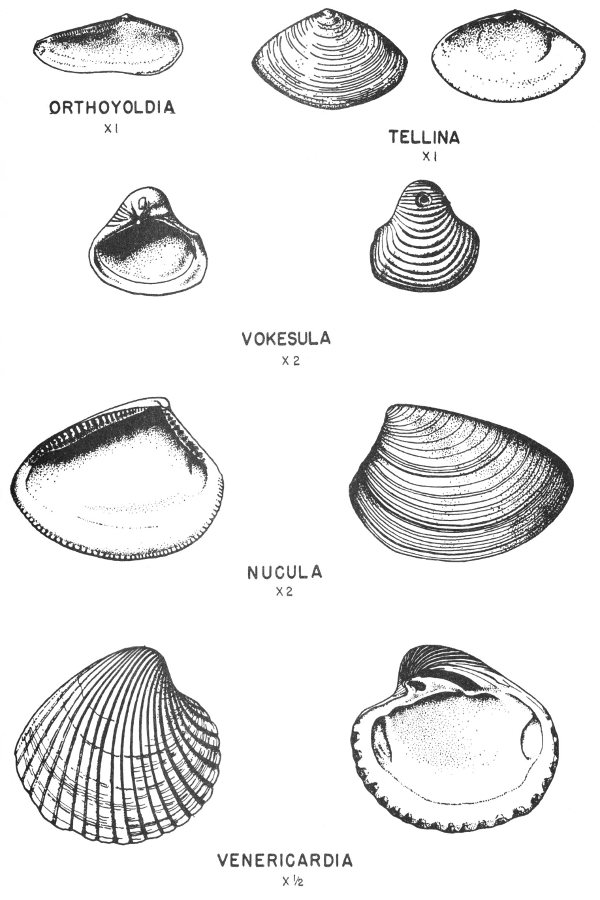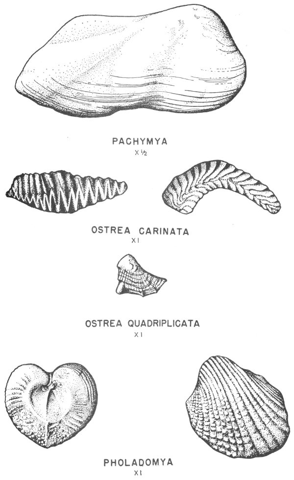 Many shells, bones, leaves, and other forms of organic matter are preserved as molds and casts. If a shell had been pressed down into the ocean bottom before the sediment had hardened into rock, it may have left the impression of the exterior of the shell. This impression is known as a mold (Pl. 2). If at some later time this mold was filled with another material, this produced a cast. This cast will show the original external characteristics of the shell. Such objects are called external molds if they show the external features of the hard parts (Pl. 2, fig. 2) and internal molds (Pl. 2, fig. 3) if the nature of the inner parts is shown.