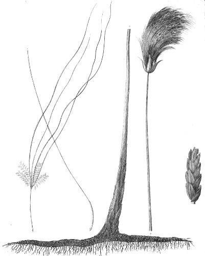 The general figure of this plant Pliny has rightly said to resemble a Thyrsus; the head is composed of a number of small grassy filaments, each about a foot long. About the middle, each of these filaments parts into four, and in the point, or partition, are four branches of flowers; the head of this is not unlike an ear of wheat in form, but which in fact is but a chaffy, silky, soft husk. These heads, or flowers, grow upon the stalk alternately, and are not opposite to, or on the same line with each other at the bottom.