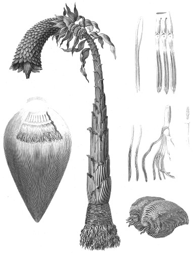 Pliny20 says it has no seed; but this we may be assured is an absurdity. The form of the flower sufficiently indicates that it was made to resolve itself into the covering of one, which is certainly very small, and by its exalted situation, and thickness of the head of the flower, seems to have needed the extraordinary covering it has had to protect it from the violent hold the wind must have had upon it. For the same reason, the bottom of the filaments composing the head are sheathed in four concave leaves, which keep them close together, and prevent injury from the wind getting in between them. 14