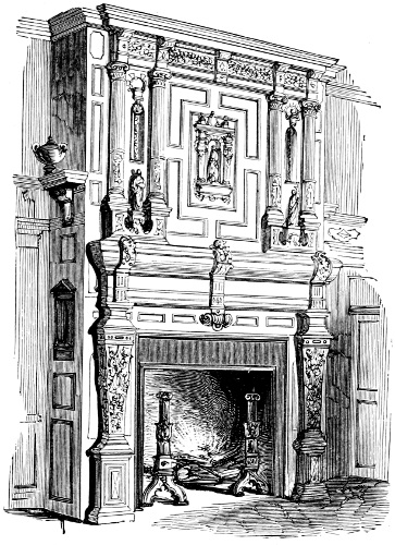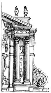 Shield-work was not so prominent in the pure Elizabethan as in the Jacobean (James I.) style; the carved stone escutcheon-like work from Crewe Hall, Cheshire, attributed to Inigo Jones (Fig. 439), shows the beginning of the Jacobean shield-work. This style is best seen in the carved-wood furniture of the period, and both it and the Elizabethan are generally speaking offshoots of the Flemish and German phases of the Renaissance. Elizabethan ornament is of great variety, the panelling and other arrangements are sometimes composed purely of strap-work of a rectangular flat perforated appearance, sometimes seen in the doorways and chimney fronts, as at Hardwick Hall, Haddon Hall, Speke and Crewe Halls. Another kind is of a more curved variety, with figures and 406animals, as seen in the illustration from an old house at Exeter now in Kensington Museum (Fig. 440); another kind 407is carved in rectangular or curved and notched frames of cartouche work with the smaller spaces and little panels carved in imitation of jewels with oval or lozenge-shaped facets. Columns of Ionic or Corinthian orders, and classic mouldings, dentils, and the egg and tongue were frequently used. The ceilings were often panelled and moulded, 409inclining in this respect more to the Gothic than classic. A bizarre kind of Renaissance architectural feature was prevalent in Holland and in some parts of Germany, which seems to have been the model for much of the “bolt and lock” style of some Elizabethan gateways. The architect Dietterlin, of Strassburg (1550-1599), was an extraordinary exponent of this twisted and bolted form of fantastic architecture, which had become only too fashionable at this period. The illustration (Fig. 441) shows an example of what might be called a mild specimen of the style of Dietterlin. The popularity of the Dietterlin craze was owing to the circulation of several volumes he had published of his impossible designs, some of which designs were evidently adapted by the Elizabethan architects, but in a much more reticent spirit.
