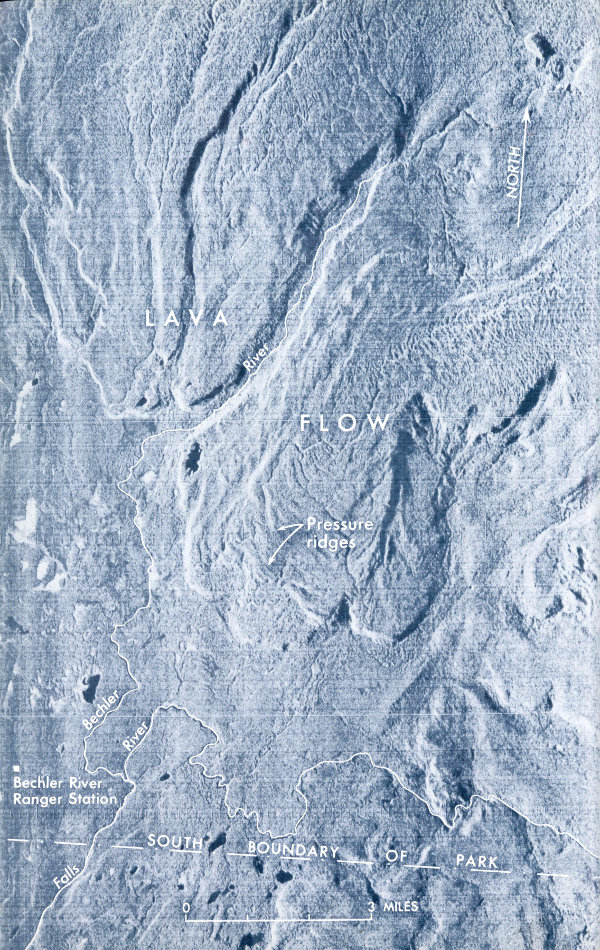 Thus, in one brief “moment” of geologic time there was launched that incredible chain of events which led to the creation of many of the natural wonders of Yellowstone National Park. Heat from the enormous reservoir of molten rock which produced the massive eruption still remains deep within the earth beneath Yellowstone, sustaining the spectacular hot-water and steam phenomena for which the Park is so justly famous. The formation of the caldera and the eruption of lavas profoundly influenced the shape of the present-day landscape. Once a land covered almost entirely by mountains, the part that collapsed—nearly one-third of the total Park area—is now characterized by low rolling plateaus formed from the thick lava flows that filled the caldera (figs. 1 and 2; see fig. 22 for the outline of the Yellowstone caldera). Moreover, the carving of the spectacular Grand Canyon of the Yellowstone (fig. 41) and the fashioning of the large interior basin now occupied by beautiful Yellowstone Lake (fig. 27) were closely related to this mighty volcanic event.