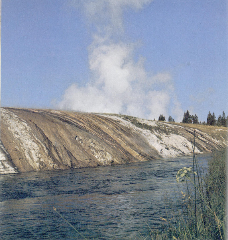 ALGAL-COLORED TERRACES lining the west bank of the Firehole River at Midway Geyser Basin. Algae are microscopic plants that grow profusely on rocks covered by hot water at temperatures up to about 170°F. (Fig. 49)