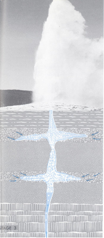 Considering a geyser system as described above and applying what is known about the behavior of water and steam, we can understand what causes a natural thermal eruption. Figure 50 shows diagrammatically the succession of events believed to occur during the typical eruptive cycle of a geyser such as Old Faithful.