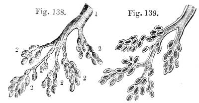 350. It is the same in aërial respiration. In the simplest form of aërial respiration the apparatus consists of minute bags or sacs, placed commonly in pairs along the back, which open for the admission of the air on the external surface, by small orifices called spiracula or spiracles29 (fig. CXXX. 2), at the sides of the body. In the common earth-worm there are no less than one hundred and twenty of these minute air vesicles, each of which is provided with an external opening placed between the segments of the body. In the leech, the number is reduced to sixteen on each side, which open externally by the same number of minute orifices. Over the internal surface of these air vesicles the blood of the system is distributed in minute and delicate capillaries; and is capable of being aërated by whichever medium may pass through the external orifices, whether water or air.