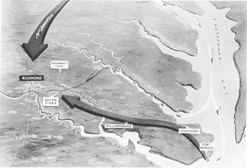Instead of marching overland, McClellan decided to take advantage of Union control of the inland waters and transport his army, with its vast supplies and materiel, down the Potomac River and across Chesapeake Bay to the tip of the peninsula between the York and James Rivers. Then with his supply ships steaming up the York, he planned to march northwestward up the peninsula, join another force under Gen. Irvin McDowell marching overland from Washington, and together, converge on Richmond.