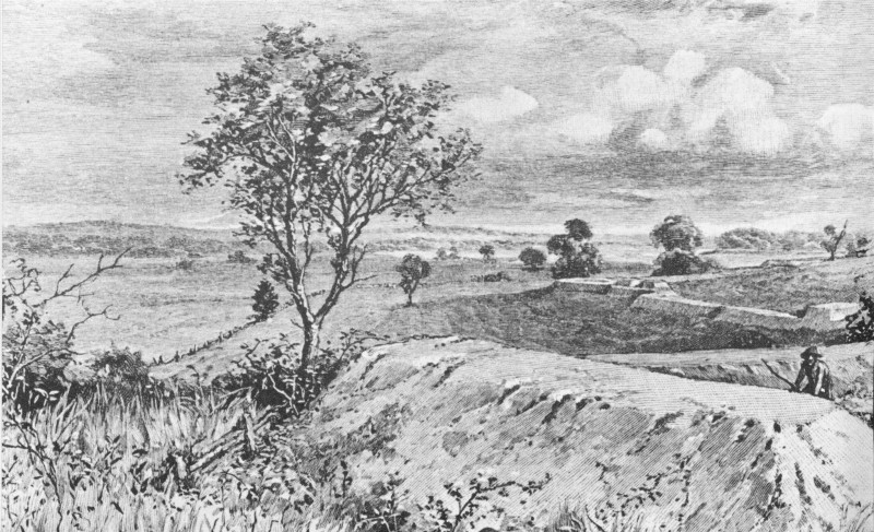 McClellan had already selected another naturally strong position, this time on Malvern Hill, for the last stand before reaching the James River. On the morning of July 1, Morell and Sykes’ divisions of Porter’s corps were drawn up on the crest of the hill west of the Quaker road. East of the road Couch’s division of Keyes’ corps held the front, with Kearney and Hooker of Heintzelman’s corps flanked to the right and rear. Sumner’s troops were in the rear in reserve. The position was flanked on either side by creeks in deep ravines less than a mile apart, and across this narrow front, Porter placed his batteries with the guns almost hub to hub. In front, the ground was open, sloping down to woods, marshes, and swamps, through which the Confederate forces had to form for attack within range of the Federal artillery.