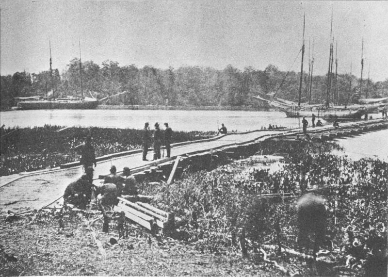 After landing at Fortress Monroe the Federal troops pushed aside the thinly held Confederate defenses at Yorktown and Williamsburg and proceeded up the peninsula according to plan. But progress was slow. Every day 500 tons of forage and subsistence were required to keep the army in the field. Early in May it rained and kept raining, day after dreary day. Federal soldiers had a saying: “Virginia used to be in the Union—now it’s in the mud.” Dirt roads turned into bottomless muck—creeks and gullies became swift flowing streams—fields were swamps. Roads and bridges had to be built and rebuilt, and still the thousands of wagons, horses, and mules continually stuck in the mud.