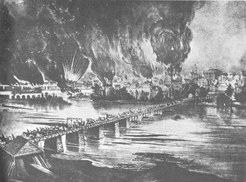 Late in the afternoon the official order was posted—then pandemonium reigned. Trunks, boxes, bundles of every description were piled on the sidewalks and in the streets. Wagons, carts, buggies, anything that had wheels and could move, were loaded and raced through the city to fight their way across Mayo’s Bridge in the mad rush to cross the James and flee south.