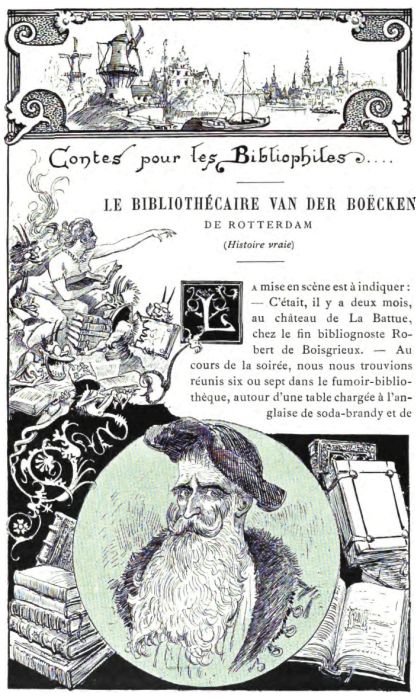 Sans l'appui de votre admirable faculté de travailleur, réalisant prestement toute idée émise, avant même qu'elle ne se soit évaporée en rêve indécis, sans le concours de votre génie d'assimilation apte à vibrer à tous les sons de cloche de la pensée et sous l'impression de tous les paradoxes développés au cours d'une conversation littéraire, il est presque certain que ces divers Contes pour les Bibliophiles se seraient envolés en vaines paroles, dans la fumée des cigarettes dont les spirales bleuâtres semblent, parfois, soutenir et envoiler la vague chevauchée des projets enjôleurs qui nous hantent au passage.