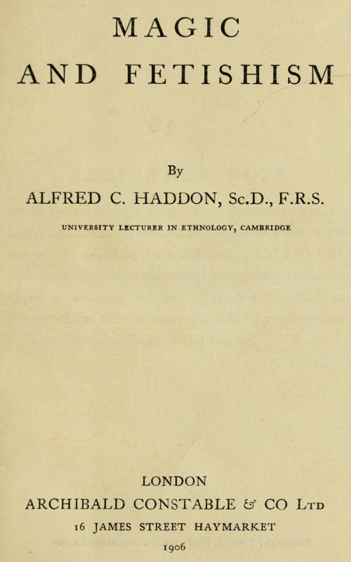 The Project Gutenberg EBook of Magic and Fetishism, by Alfred C. Haddon This eBook is for the use of anyone anywhere in the United States and most other parts of the world at no cost and with almost no restrictions whatsoever. You may copy it, give it away or re-use it under the terms of the Project Gutenberg License included with this eBook or online at www.gutenberg.org. If you are not located in the United States, you'll have to check the laws of the country where you are located before using this ebook. Title: Magic and Fetishism Author: Alfred C. Haddon Release Date: March 31, 2020 [EBook #61725] Language: English Character set encoding: UTF-8 *** START OF THIS PROJECT GUTENBERG EBOOK MAGIC AND FETISHISM *** Produced by deaurider and the Online Distributed Proofreading Team at https://www.pgdp.net (This file was produced from images generously made available by The Internet Archive)