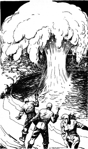 Val Kenton gasped suddenly; for, exploding from the water in a spray that resembled fire, a scaly blunt something suddenly appeared. For one second, its three hundred foot body was black against the water, and then, majestically, it slid from sight into the depths again.