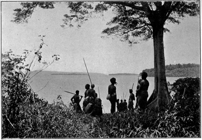 From where we stood we could see, like a little dot upon the blue of the ocean, our whaleboat hanging offshore. The scene was calm and beautiful. The brown-green slopes were silent, except for the sharp metallic calls of birds. But we knew that there were men hidden in the wild, by the faint, thin wisps of smoke that we could see here and there above the trees. Each marked a savage camp-fire. “That’s where they’re cooking the ‘long pig,’” I said jocularly, pointing the smoke wisps out to Osa. But 17a moment later my remark did not seem so funny. I heard a sound and turned and saw standing in the trail four armed savages, with their guns aimed at us.
