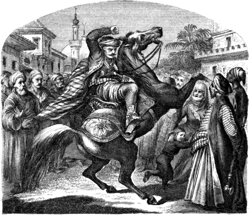 Ezen pillanatban észrevevé a nagyvezér, hogy a nép, mely a lovagokon erőt vett, s a piaczot ellepte, a palota kőfalait több helyen lábtókkal kezdi megszállni, sőt itt ott zajongó dühhel lerongálni, hogy magának rést nyithasson. Mondá tehát a szultánnak, még mielőtt ez a csapásra jelt adna: „Kérem Felségedet, jól fontolja meg, a mit tenni készül. A nép már a palota falait ostromolja, és ha ide be talál rontani, a következés igen kártékony lehet.“ „Mit? palotámat ostromolni? – válaszolt a szultán – ki meri ezt cselekedni?“ „Uram“ monda a nagyvezér – pillantson csak Felséged palotája falaira, vagy a piaczra, s állitásom igazsága nem lesz kétséges.“