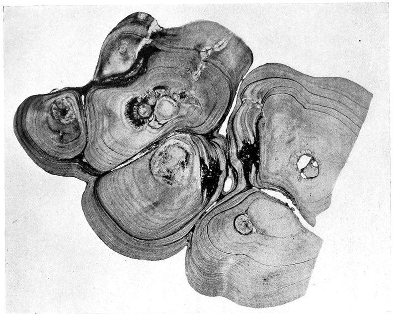 Cross section of an irregular pearl, magnified 80 diameters. Cross sections of pearls, magnified 30 diameters. Thin section of mother-of-pearl, magnified, showing sponge borings which traversed the pearl shell. Structure of conch pearl produced by fracturing, magnified 80 diameters | 53 |
