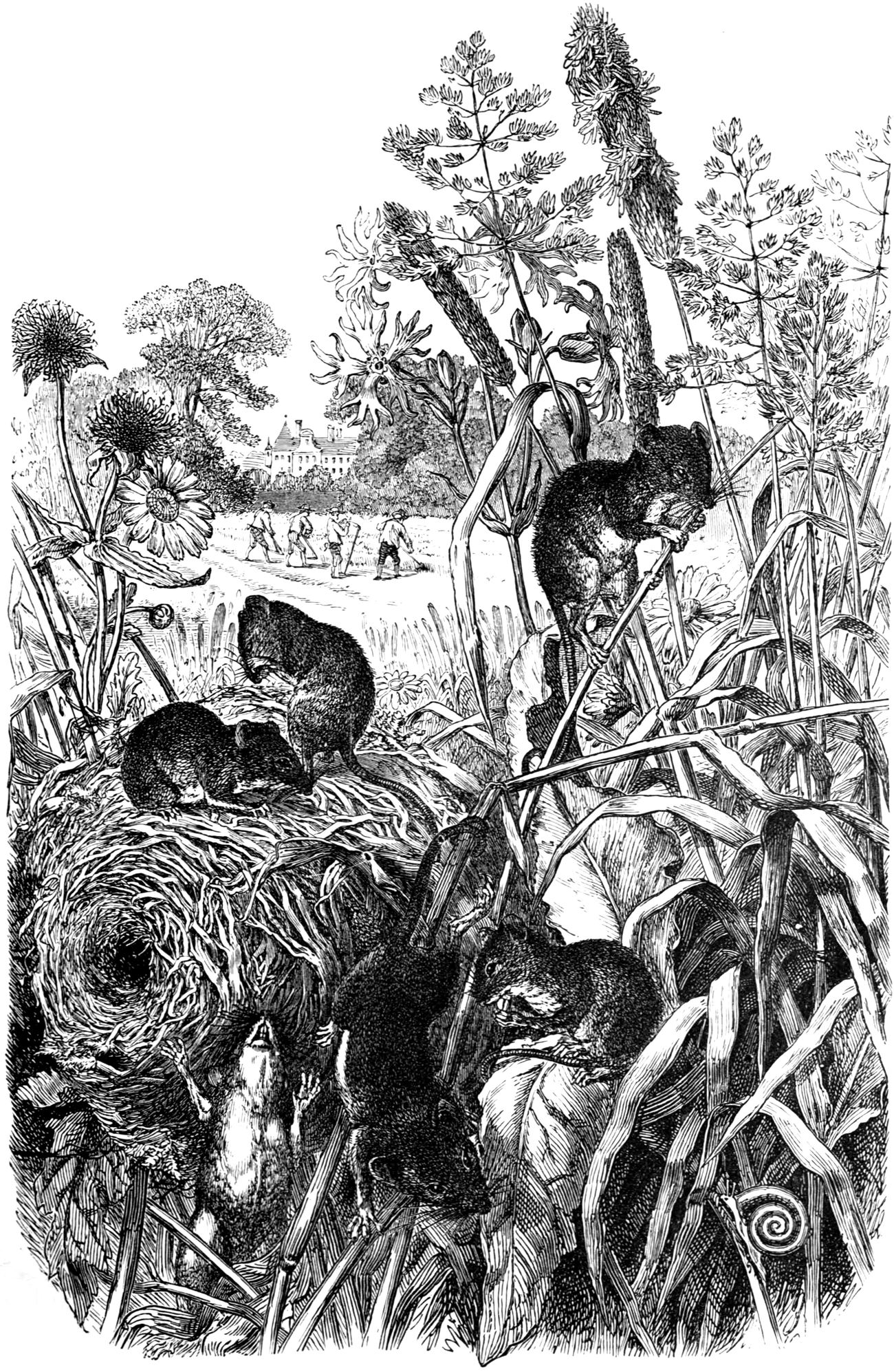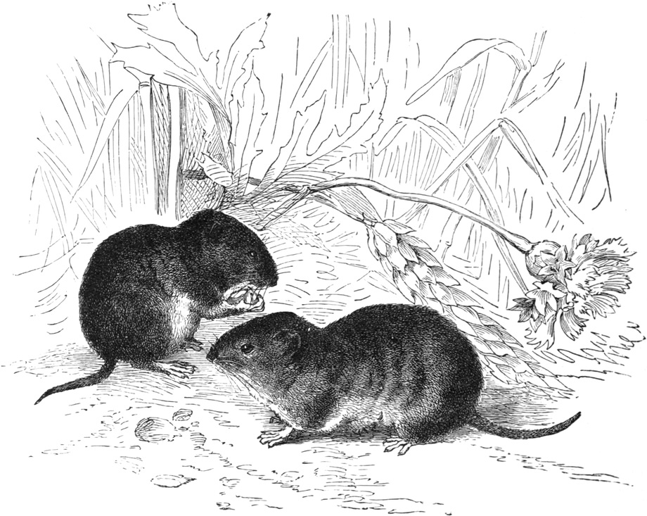 | THE MOUSE-LIKE RODENTS—MYOXIDÆ—Characteristics—THE DORMOUSE—Description—Habits—Activity—Food—Winter Condition—THE LOIR—THE GARDEN DORMOUSE—LOPHIOMYIDÆ—How the Family came to be Founded—THE LOPHIOMYS—Milne-Edwards’ Opinion—Skull—General Form—Habits—MURIDÆ—Number of Species—Characteristics—Variety of Forms—Distribution—The Murine Sub-Family—THE BROWN RAT—History—Fecundity and Ferocity—Diet—At the Horse Slaughter-houses of Montfaucon—Shipwrecked on Islands—Story of their Killing a Man in a Coal-pit—In the Sewers of Paris and London—THE BLACK RAT—THE EGYPTIAN RAT—THE COMMON MOUSE—Habits—Destructiveness—Colours—THE LONG-TAILED FIELD MOUSE—Description—Food—THE HARVEST MOUSE—Description—Habits—In Winter—Agility—Their Nest—THE BANDICOOT RAT—THE TREE RAT—THE STRIPED MOUSE—Allied Genera—THE WHITE-FOOTED HAPALOTE—The American Murines—THE WHITE-FOOTED, OR DEER MOUSE—THE GOLDEN, OR RED MOUSE—THE RICE-FIELD MOUSE—THE AMERICAN HARVEST MOUSE—THE FLORIDA RAT—Description—Their Nest—Food—Mother and Young—THE BUSHY-TAILED WOOD RAT—THE COTTON RAT—THE RABBIT-LIKE REITHRODON—THE HAMSTERS—Characteristics—Appearance—Distribution—Burrows—Disposition—Food—Habits—THE TREE MICE—THE BLACK-STREAKED TREE MICE—THE GERBILLES—Characteristics—Habits—Other Genera—THE WATER MICE—Characteristics—Species—THE SMINTHUS—THE VOLES—Characteristics—THE WATER VOLE—Appearance—Distribution—Food—THE FIELD VOLE—THE BANK VOLE—THE SOUTHERN FIELD VOLE—THE SNOW MOUSE—THE ROOT VOLE—THE MEADOW MOUSE—THE PINE MOUSE—THE MUSQUASH, MUSK RAT, OR ONDATRA—Distinguishing Features—Habits—His House—THE LEMMING—Description—Food—Habits—Disposition—Their Extraordinary Migrations—Other Lemmings—THE ZOKOR | |